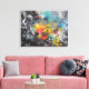 Peinture Abstraite dans de nombreuses couleurs. Les bleus, jaunes et rouges de cette peinture imaginative sont placés dans un arrière - plan de noir, blanc et gris. Cette peinture acrylique semble susciter des sentiments de bonheur et d'excitation.