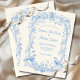 Elegant Toile de jouy Wedding invitations. Features love birds and butterflies with floral frame in blue on a light cream background. Perfect for a country French wedding. To make more changes go to Personalize this template. On the bottom you’ll see “Want to customize this design even further? Click on the EDIT using Design tool. From there you can change some of the fonts & some colours, move things around or delete what you need.