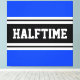 Cette conception sportive et sportive présente un texte HALFTIME en gras à l'intérieur d'une large bande noire surlignée avec deux bandes blanches contre un arrière - plan bleu vif. Le texte de cette conception peut être personnalisé.