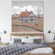 Colourful artwork of an old medieval house in the English countryside, with an old church in the background, and a couple of hares boxing in the foreground. Perfect for anyone who loves folk art.