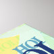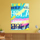 Hola texte répété dans une palette colorée de bleu, jaune, rose, turquoise et vert.