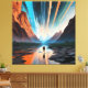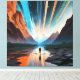 Un voyageur solitaire se promène au milieu de montagnes imposantes reflétées dans des eaux calmes, tandis que le ciel explose de poutres cosmiques. La scène mêle nature et univers, invitant à la réflexion sur le voyage intérieur et l'immensité des rêves humains.