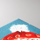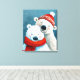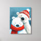 Cette image montre deux ours polaires dans une étreinte chaleureuse, dressée contre un arrière - plan enneigé et de tonalité turquoise. L'ours plus gros porte un casquette tricot rouge, décoré de motifs subtils, tandis que l'ours plus petit est enveloppé d'une écharpe rouge vif. Les deux ours ont des joues douces et roses et des expressions sereines, créant une atmosphère d'hiver douillette et affectueuse. Le style texturé et peint renforce la chaleur et le charme de la scène.