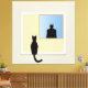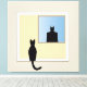 En svart katt sitter vid ett fönster och ser en silhuett av en superhjältefigur i det motsatta fönstret.