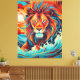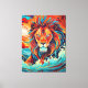 Lion's Fire Dance Canvas Imprimer Impression de toile vibrante représentant un lion majestueux entouré de vagues tourbillonnantes et de flammes scintillantes, créant une danse fascinante de couleurs et d'éléments.