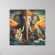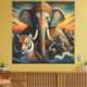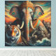 L'oeuvre dépeint une scène puissante et mystique, mêlant des éléments de spiritualité, de mythologie et de nature. La figure centrale dégage un sentiment de sérénité et de force, tandis que les animaux environnants ajoutent à l'aura globale de puissance et de mystique. Figure centrale La figure centrale semble être une déesse ou une divinité, ornée de bijoux en or complexes et d'une expression sereine. Son visage à mi-ombre pourrait symboliser la dualité ou une connexion entre différents royaumes. Son interaction douce avec le tigre suggère compassion et harmonie avec
