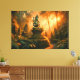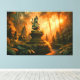 Cette toile représente une scène sereine dans une jungle indonésienne luxuriante. Le centre d'intérêt est une statue sculptée d'une divinité, probablement d'origine hindoue ou bouddhiste, assise dans une pose méditative sur un piédestal orné. La statue est rendue dans une teinte molle, bleu-vert, contrastant avec la lumière dorée chaude qui traverse le feuillage dense. D'autres statues similaires bordent le chemin, créant un sentiment d'espace sacré dans l'environnement verdoyant. La scène est baignée d'une lueur chaude et éthérée, suggérant le lever ou le coucher du soleil, et le rendu détaillé du feuillage de la jungle ajoute profondeur et réalisme à l'atmosphère mystique.