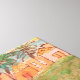 Cette oeuvre a été peinte à la main à l'aide de peinture acrylique et aquarelles, créant une scène "d'accueil de vacances" avec trois voiliers, de jolis palmiers et plusieurs condos, situé sur une île quelque part dans les belles eaux bleues de l'océan, avec de magnifiques ciels dorés.