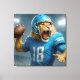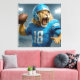 Un lion en tenue de football, à l'expression féroce, se prépare à lancer un ballon de football sur le terrain alors que des lumières illuminent la scène