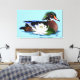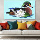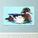 Un canard à bois dans l'eau avec un nénuphar blanc à côté du canard dans un fond bleu