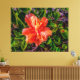 Cette Impression de toile nous apporte la beauté d'une fleur d'hibiscus orange qui se réveille jusqu'au soleil du matin. La photo originale de ZoeSPEAK se concentre sur les pétales de fleurs avec toutes leurs courbes, la façon dont ils se superposent. Profitez de la douce couleur orange de la fleur contre les couleurs vert printanier des feuilles du jardin.