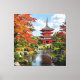Un point de repère architectural japonais serein au milieu d'un feuillage rouge et orange vif qui se reflète sur un étang calme. Le ciel bleu clair met en valeur le paysage paisible, symbolisant la tranquillité et la beauté de la culture traditionnelle.