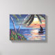 Deux palmiers côtiers et un voilier sur l'océan au coucher du soleil avec oiseaux et fleurs. Magnifique paysage saisonnier de peinture acrylique d'une plage tropicale des Caraïbes. Original peint à la main par Donna Leger pour ©irony designs