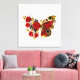Papillon de fleurs aux yeux de paon rouge à aile texturée rouge, décoré de composition de roses rouges, artistiquement peints avec des tiges dorées et feuilles sur arrière - plan blanc.