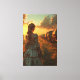 Une femme en robe vintage se tient devant une caravane au coucher du soleil, évoquant un sentiment d'aventure et de nostalgie. La chaleur du soleil couchant et la tenue historique laissent présager un voyage dans le temps.