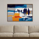 Loose, confident brushstrokes and geometric color fields give the piece a modern, painterly structure. The figures appear anonymous and universal, emphasizing shared experience rather than individuality. There is a sense of transition in the scene—between weather and calm, movement and pause—making the artwork emotionally resonant and quietly powerful.