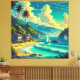 Cette oeuvre capture une scène côtière okinawaïenne sereine dans un style onirique inspiré du lofi. La plage d'or est bordée de maisons balnéaires rustiques, de hauts palmiers et d'une jetée en bois qui s'étend sur les vagues turquoise. Les voiliers dérivent paresseusement à travers l'eau, tandis que l'arrière - plan présente des montagnes verdoyantes, un pont lointain, et un ciel ensoleillé avec des nuages fluides et une lune croissant. Les lumières tamisées et nostalgiques, les couleurs vibrantes et apaisantes créent une atmosphère paisible et relaxante, parfaite pour une esthétique lofi.