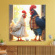 Un coq et une poule habillés en tenue humaine se font face avec un oeuf entre eux dans une grange avec la lumière du soleil filtrant à travers