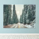 Une route asphaltée droite s'étend au loin, flanquée de grands arbres à feuillage persistant recouverts de neige. La route a une ligne de démarcation jaune en bas du centre. Le ciel est couvert, avec un soleil diffuse à peine visible à travers les nuages. La neige est visible sur les côtés de la route et sur les branches des arbres. La scène évoque un sentiment de solitude tranquille et de beauté hivernale.