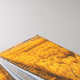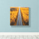 Une route longue et rectiligne qui traverse une vaste étendue de forêt d'automne dorée. La route semble disparaître dans la distance brumeuse, créant un sentiment de mystère et d'intrigue. Le feuillage jaune vif des arbres contraste magnifiquement avec le ciel gris, ajoutant à l'effet dramatique global. Une seule voiture longe la route, mettant l'accent sur l'immensité du paysage et la solitude du voyage.