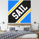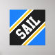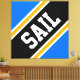 This sporty bold design features athletic SAIL text inside a highlighted wide diagonal black, white, and golden yellow orange racing stripes against bright blue background. The text in this design can be personalized.