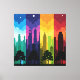 Une silhouette à quatre panneaux de paysage passant par les saisons avec des arrière - plans de ciel vibrants Description : Un quatuor de paysages urbains présentant le même skyline passant par le printemps, l'été, l'automne et l'hiver. Chaque panneau présente une silhouette noire foncée contre un ciel de couleur spectaculaire représentant la saison. Le contraste et la progression des couleurs créent une narration visuelle puissante. Idéal pour les impressions multi-toile ou un grand affichage simple pièce. Appelle les citadins, les voyageurs et ceux qui apprécient le design minimaliste avec une utilisation audacieuse des couleurs.