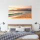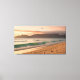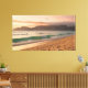 Une scène côtière paisible avec des vagues douces qui lèvent au bord. Le ciel est inondé de teintes d'orange et de rose, jetant une lumière chaude sur l'eau et les montagnes lointaines.