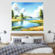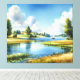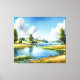 This tranquil watercolor painting captures the peaceful beauty of a calm lake on a bright, sunny day. A solitary sailboat drifts effortlessly across the water, its white sail catching the light as the surrounding nature reflects off the surface. Lush greenery and soft blue skies enhance the scene, evoking a sense of calm and harmony in the natural world. The gentle ripples in the water and the vibrant colors of the landscape invite the viewer to pause and appreciate the serenity of this moment in time.