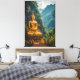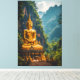 This stunning artwork captures a colossal Golden Buddha statue seated in deep meditation, set against a dramatic backdrop of lush Thai jungle cliffs. The vibrant gold of the statue radiates warmth, contrasting beautifully with the deep emerald greens and misty blues of the towering limestone karsts and dense foliage. The gentle light illuminating the scene creates an atmosphere of profound tranquillity and spiritual power.