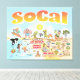 L'art lumineux et coloré offre une vue spectaculaire sur la Californie du Sud - personnages délirants qui s'éternisent sur la plage et le désert de SoCal, mettant en vedette les parcs de Los Angeles, Orange County, San Diego, Père Noël Barbara, Riverside, Palm Springs, El Centro, Anza Borrego et Joshua Tree ainsi que les villes frontalières de Tijuana, Tecate et Mexicali. Cette scène pleine de charme a tout - un surfeur pend dix tandis qu'un orque saute de l'eau, des animaux zoo saluent les touristes, un compagnon musclé se met à impressionner comme un T-Rex rugit un défi et un réservoir se met en position et bien plus encore...