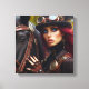Un superbe coureur à vapeur victorien Lady foncé, avec des yeux bleus percés, des cheveux rouges, des lunettes et chapeau haut, se dresse à côté de son magnifique cheval noir en vêtements de cuir avec des engrenages d'horlogerie dans un royaume historique steampunk.
