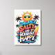 Front and center is the funky, feel-good quote, wrapped in sunny beach elements: a cool cartoon sun rocking shades, swaying palm trees, vintage surfboard, rolling ocean waves, and cheerful tropical accents like starfish and hibiscus blooms. It’s a whole summer mood — radiating happiness, heat, and high tides.