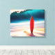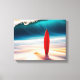 Planche de surf orange dressée dans le sable de plage avec énorme vague océanique