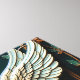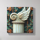 A square relief sculpture featuring a classical column adorned with wings, set against a dark green background with botanical elements. The column, positioned in the lower center, is a pale, weathered white with vertical fluting and decorative molding at the base and capital. Atop the column sits a stylized capital with a prominent volute, from which a pair of stylized wings extend upwards and slightly to the right.