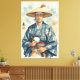 The man is positioned centrally, facing the viewer with a steady, perhaps intense, gaze. He has dark hair, a light mustache, and a short beard. He wears a large, conical straw hat (often called a sandogasa) resting on his head, tied with a blue cloth or bandana. A small, reddish-brown plume or tassel decorates the top of the hat.