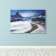 Impression paysagère en toile du célèbre train ferroviaire rouge Gornergrat à travers la neige dans les Alpes avec vue sur la majestueuse montagne du Mont Matterhorn au-dessus de la station de ski Zermatt en hiver suisse dans le canton du Valais, Suisse.