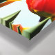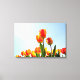 Impression de toile avec des fleurs composées de tulipes orange et rouge vue d'un point de vue bas sur un ciel bleu.