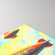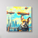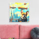 Un Bulldog français occupe une place de choix sur un toit avec en toile de fond un paysage fantastique de ville qui présente des monuments mondiaux emblématiques. Plusieurs avions flottent dans le ciel, ajoutant à l'atmosphère capricieuse.