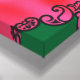 La conception semble être une oeuvre numérique ou stylisée divisée en deux panneaux par une ligne verticale verte. Voici une description détaillée : ・ Panneau gauche : o Présente un collier orné suspendu dans l’air au-dessus d’une roche violette. o La roche est entourée de feuillage vert et rouge. ・ Panneau droit : o Ce côté est une version miroir et légèrement modifiée de la gauche. o Le collier est absent. o Il y a des variations dans le placement du feuillage. La composition symétrique et les couleurs vibrantes et contrastées créent un effet visuel frappant.