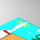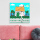 Maison avec clôture au bord de l'eau de la plage avec arbres et fleurs tout autour. Le cadre montagnard de l'arrière - plan. Deux femmes à l'extérieur font du sport tandis qu'une femme regarde par la fenêtre pendant que la radio joue. Le chien aboie au flamingo ambulant et le voilier passe tranquillement par.