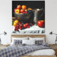Il s'agit d'une peinture à vie morte générée par l'IA avec un bol d'argent de fruits et un lanceur d'argent.