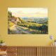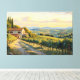 Ce tableau présente un vignoble à couper le souffle en Toscane baigné par la lumière dorée du coucher du soleil. Des rangées de vignes luxuriantes s'étendent sur des collines ondoyantes, menant à une ferme rustique aux toits de terre cuite nichée au milieu de la verdure. Au loin, de charmantes villas et petits villages parsèment le paysage pittoresque, encadré de majestueuses montagnes sous un ciel pastel. La lumière chaude du soleil projette de longues ombres, ce qui renforce la sérénité et la beauté intemporelle de la campagne italienne. Le décor évoque un sentiment de tranquillité, de tradition et de charme rustique.