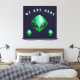 Cool fun canvas print with a printed image of 3/three green alien heads on a very dark blue background, with a caption/phrase which reads "WE ARE HERE"