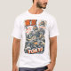 Retro-inspired T-shirt design featuring a powerful vintage robot towering over Tokyo, with bold Japanese characters and explosive energy. A striking mix of Japanese pop culture, sci-fi, and classic poster style.