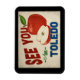 A charming Toledo Ohio vintage travel wall refrigerator magnet featuring a lovely red apple, along with fun retro style text that says, "See you in Toledo"