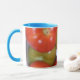 A white mug with blue rim and handle, decorated with a photo of ripening tomatoes