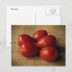 This delicious postcard features a still life photograph of 5 ripe, juicy, red tomatoes, bursting with great taste. They are arranged on a golden brown straw mat.