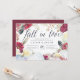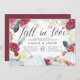 D'élégantes invitations rustiques pour les fêtes de fiançailles d'automne ou d'automne sont entourées de fleurs d'aquarelle bordeaux, de plumes de saumons et de citrouilles blancs. "Fall in love" apparaît en haut dans le script de calligraphie chic en lettres. Personnalisez avec vos détails de célébration fiançailles sous la riche lettres bleu marine.