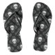 Belle tongs de goth féminin avec un joli motif crânien sur le pied-lit. Damas noir et gris avec crânes blancs avec sangles noires. Mignonne mode d'été gothique. Ou porter à Halloween s'il fait chaud là où vous êtes à cette période de l'année. Je pense que ceux-ci seraient mignons avec des ongles d'orteils vernis noir et un bracelet de cheville. Idéal pour Halloween aussi dans les climats plus chauds.