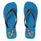 Cette paire de tongs est composée d'un mélange de bleu foncé et plus clair avec une sirène aux cheveux foncés et une queue verte tenant une chaîne dorée de coeurs rouges sur le talon des deux tongs.